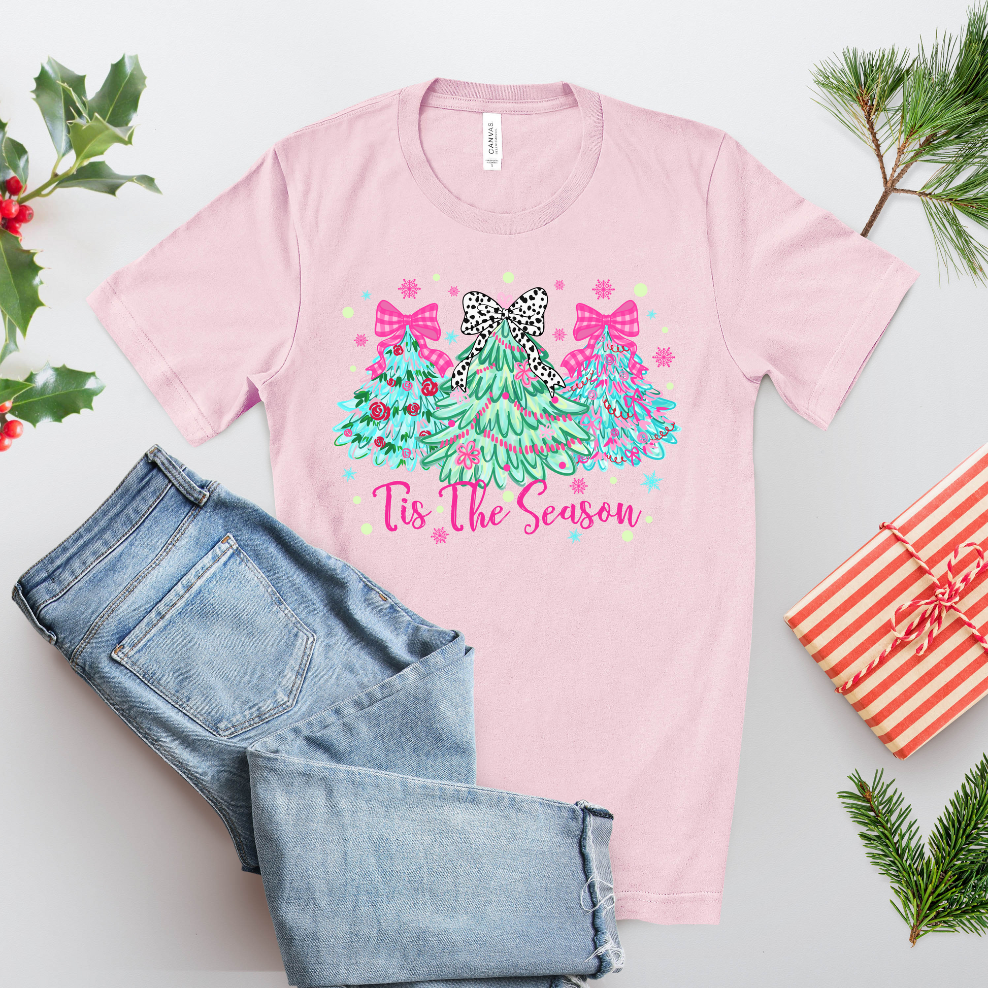 Add a colorful twist to your Christmas wardrobe with our ’Tis the Season Christmas Tree T-Shirt – Cute Holiday Graphic Tee. Featuring three festive trees decorated in pink, mint, and leopard print bows, this playful design brings trendy flair to traditional holiday fashion.
